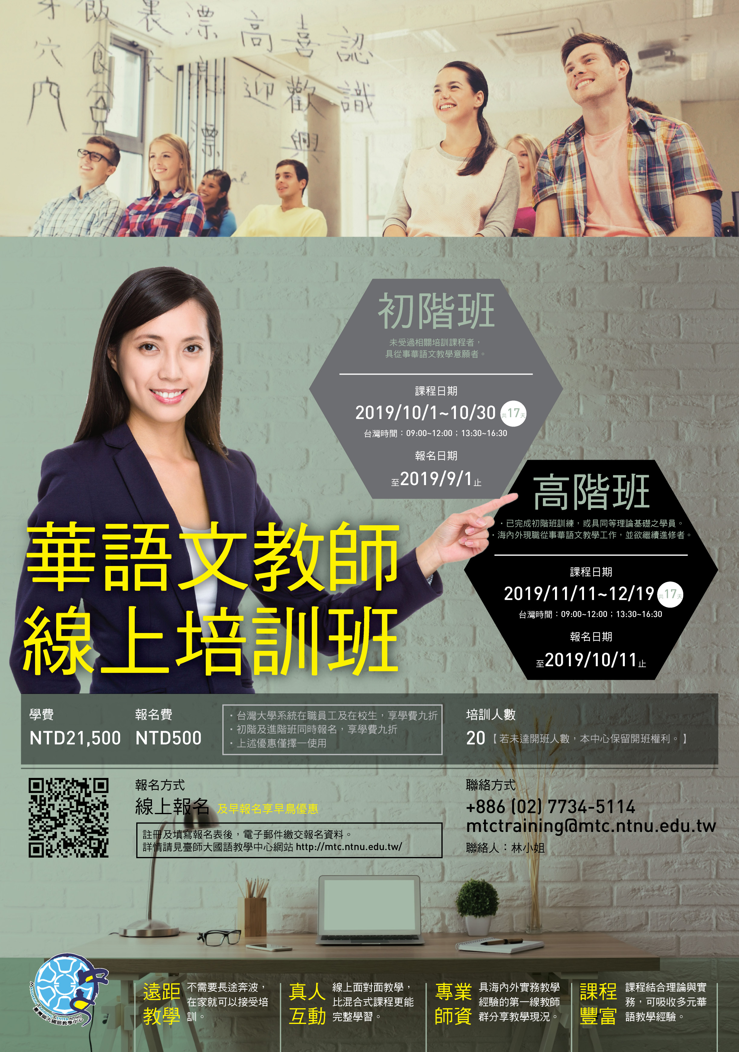 國立臺灣師範大學國語教學中心為培訓海內外專業優良之華語文師資,開辦線上華語文教師培訓班,提供海內外華語教師進修機會。