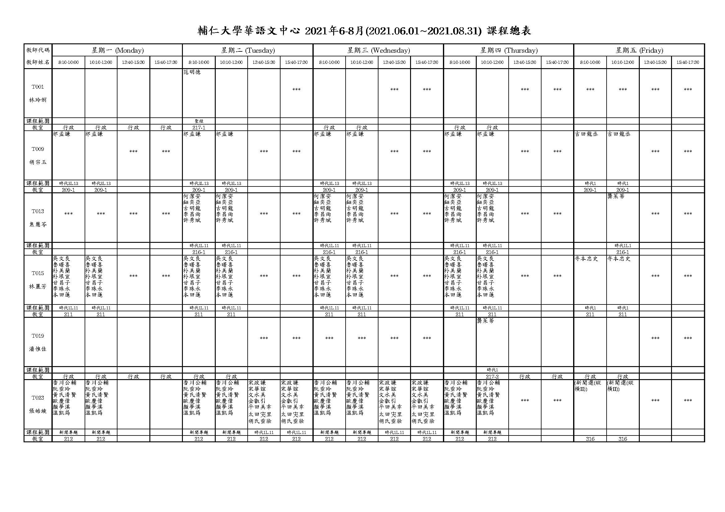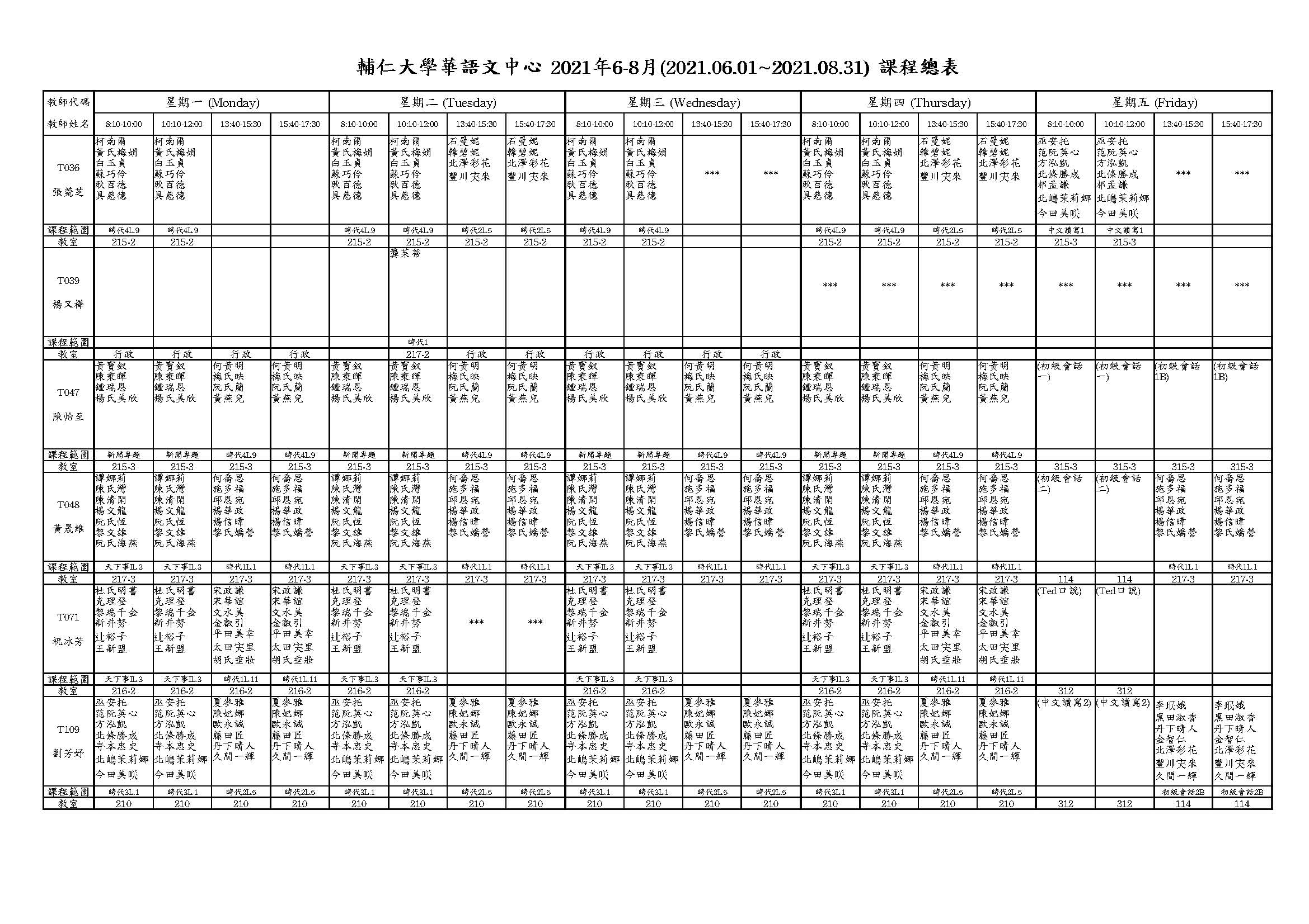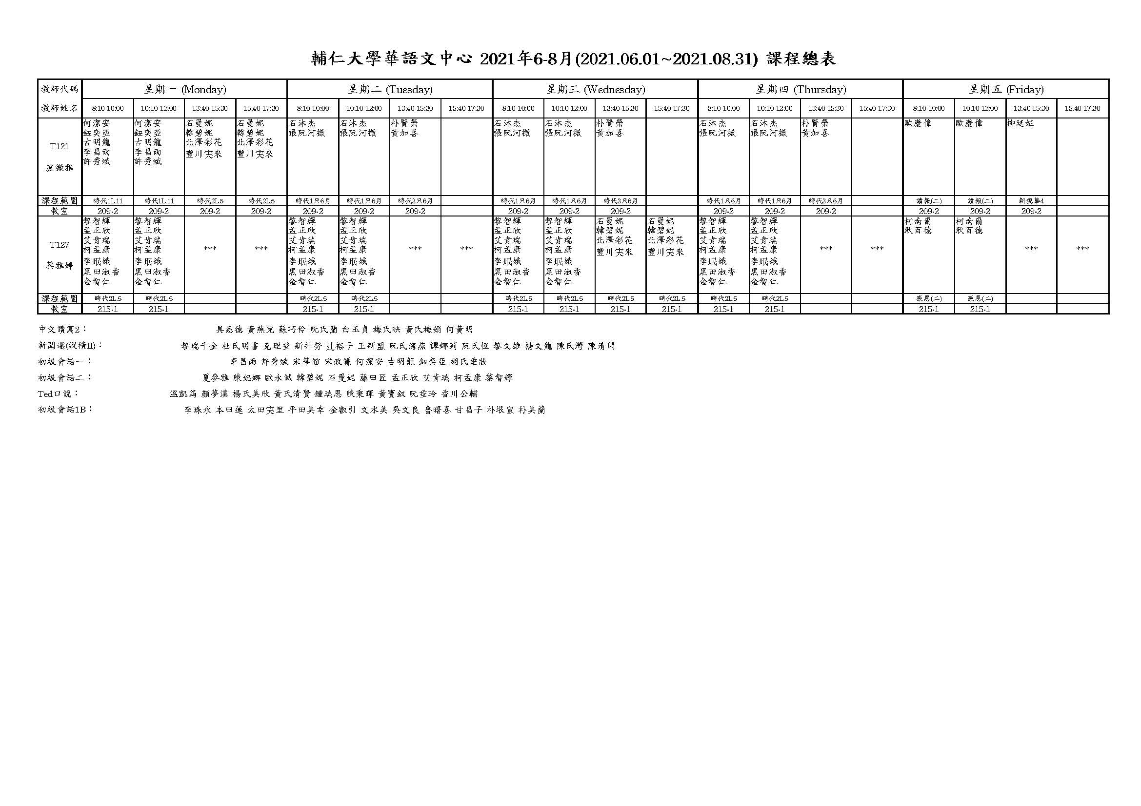 2021年夏季班新課表更新了, 請同學注意自己的上課時間,如果你的名字8:10-10:00和10:10-12:00,你的早上上課時間是9:10-12:00。星期五的課程請看最後一張課表的最下面,找到自己的名字和課程名稱後,再看上面的課程及老師。