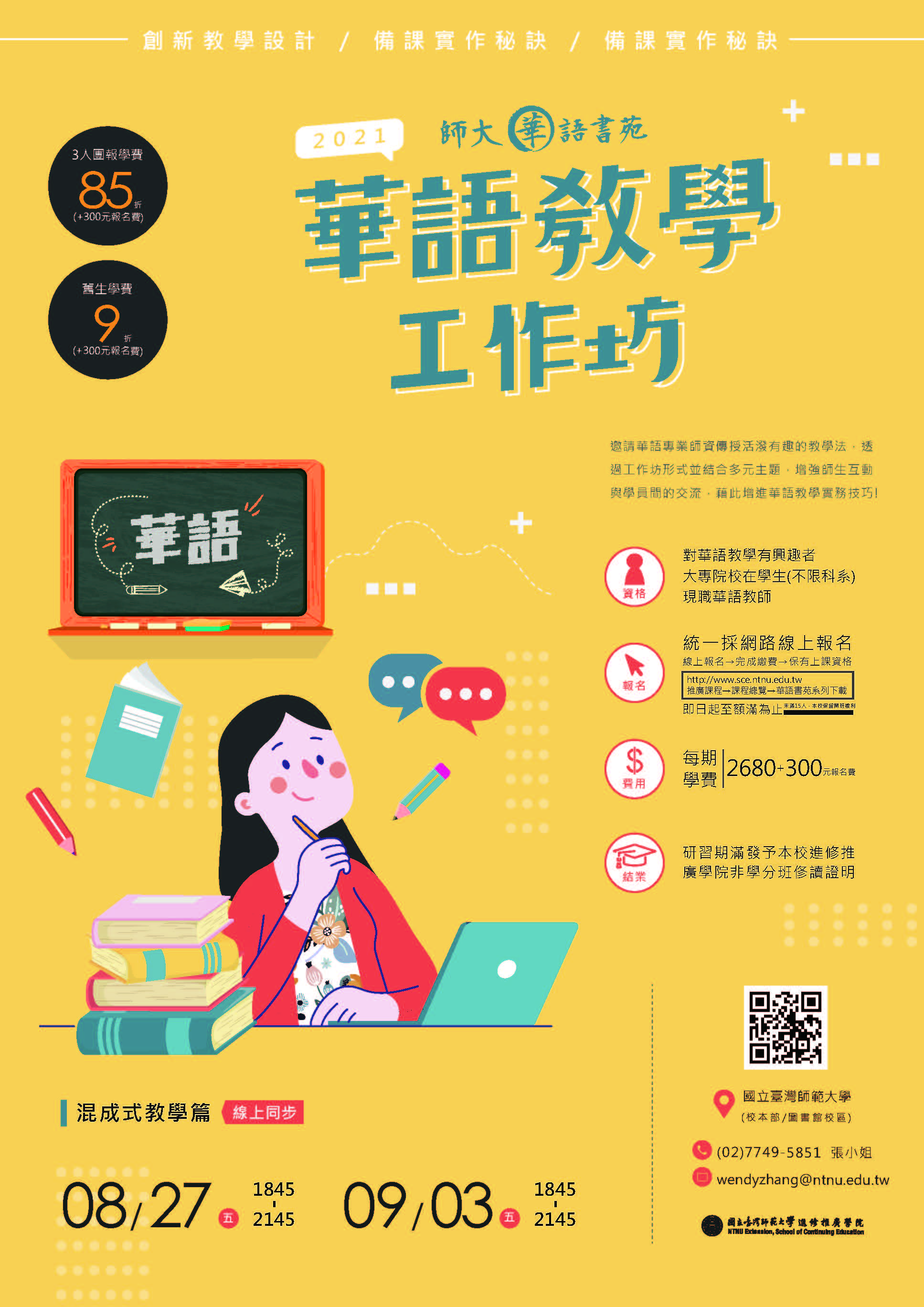 國立臺灣師範大學為積極培訓輔導華語文教學師資,辦理「(線上同步課程) 2021華語教學工作坊-混成式教學篇」,將於8月27日至9月3日期間舉行。