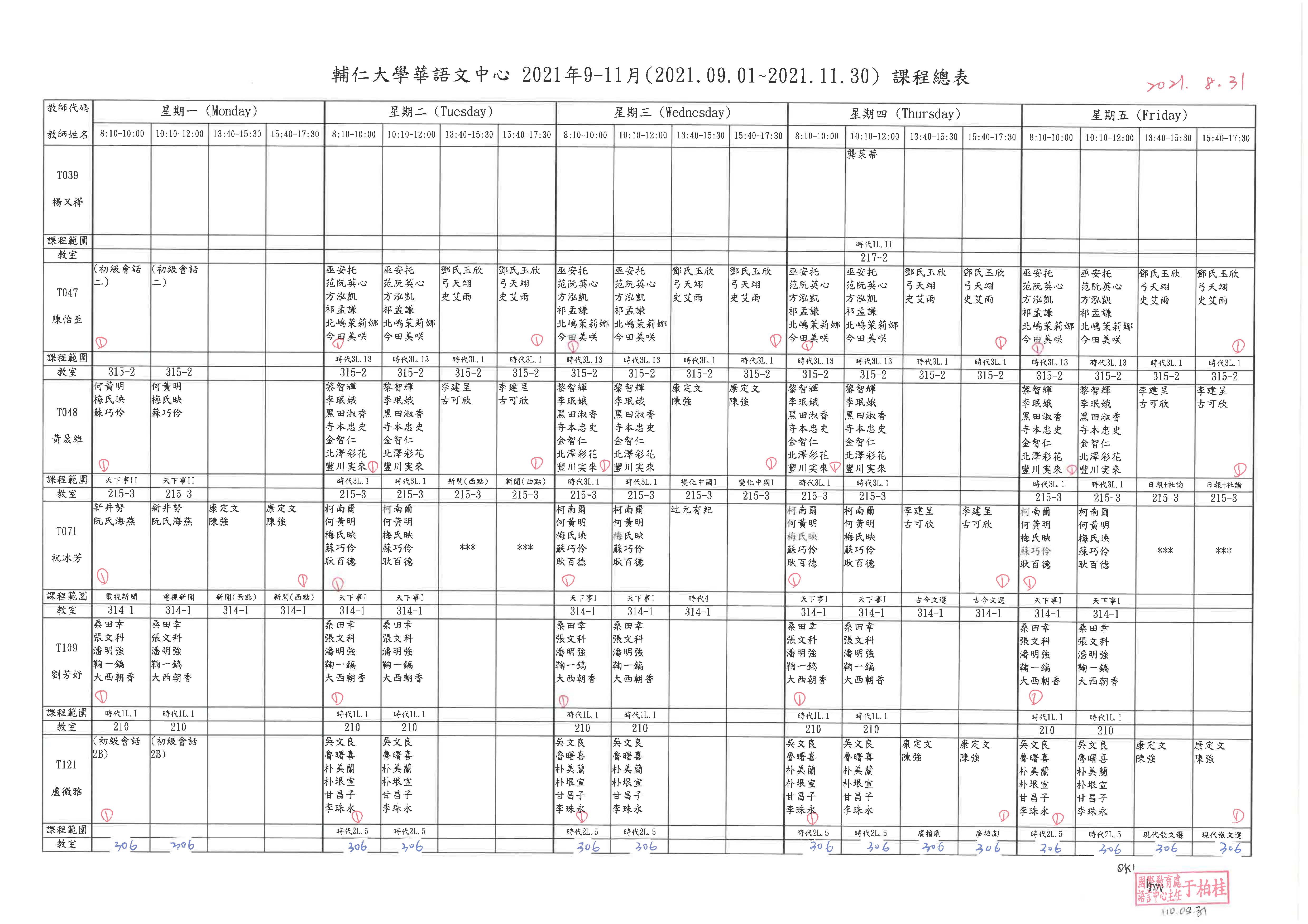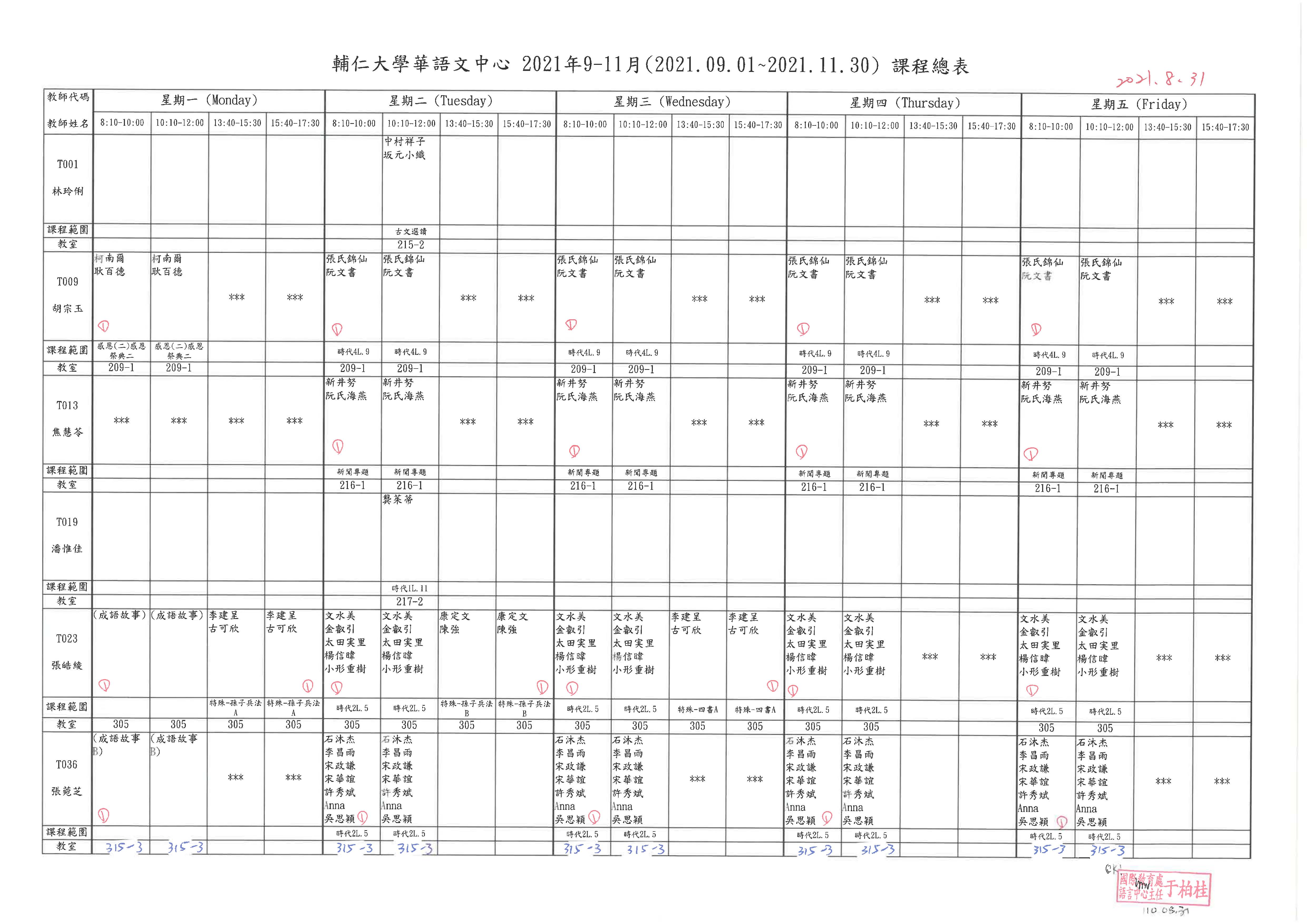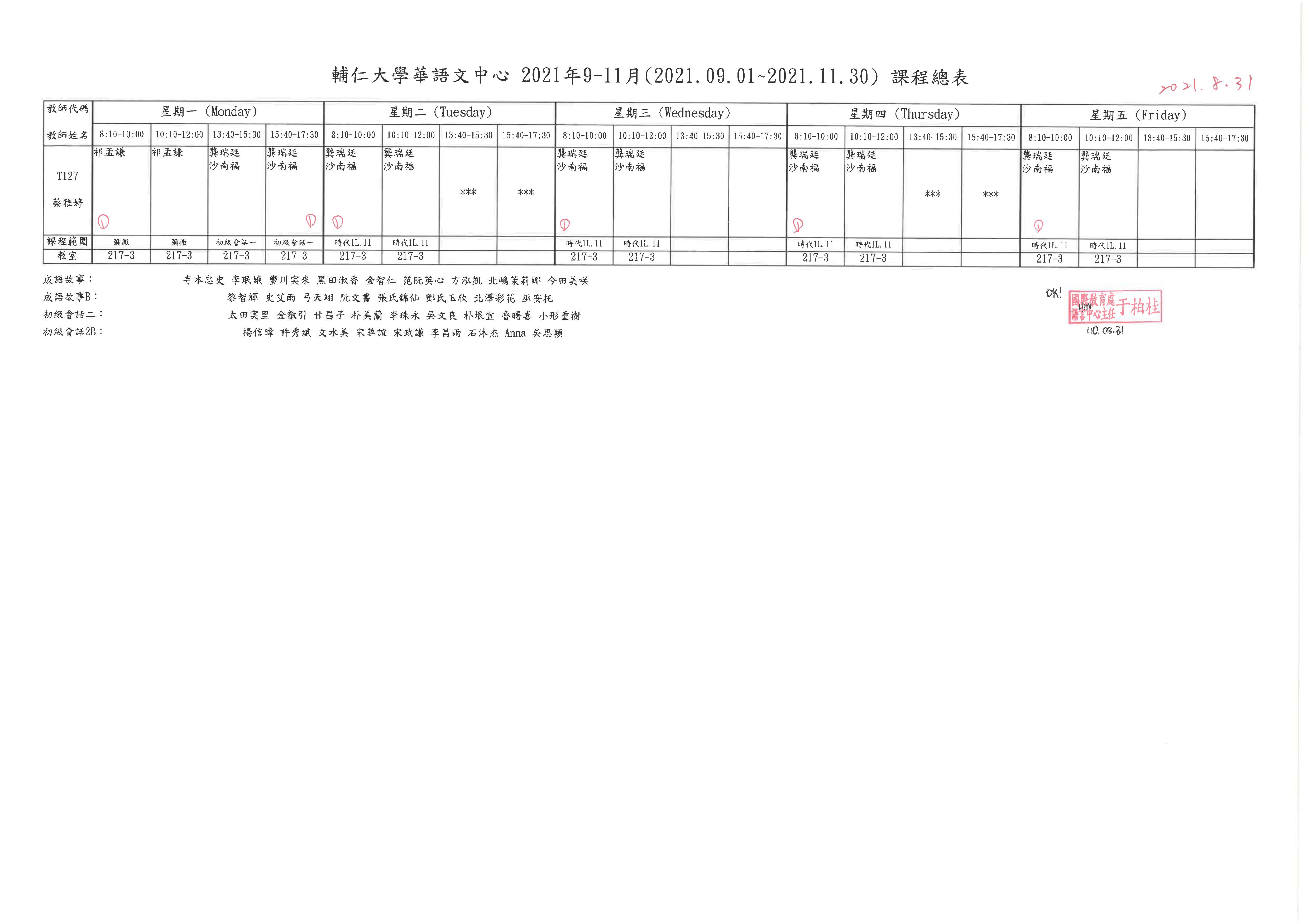 2021年秋季班課表如下, 請同學注意自己的上課時間,如果你的名字8:10-10:00和10:10-12:00,你的早上上課時間是9:10-12:00。星期一的課程請看最後一張課表的最下面,找到自己的名字和課程名稱後,再看上面的課程及老師。