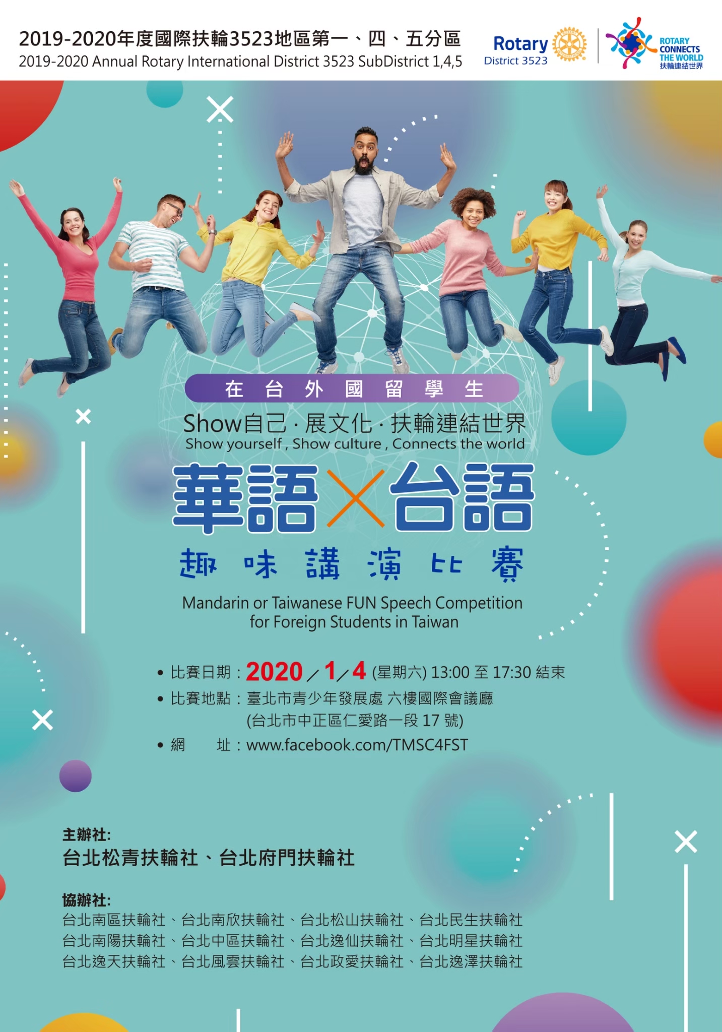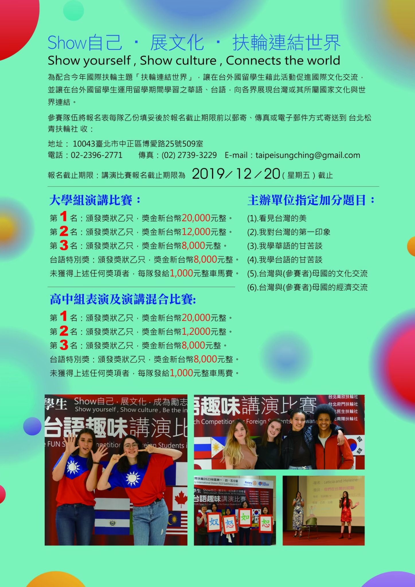 扶輪社舉辦華語X台語趣味演講比賽 2019-10-31• 活動訊息 扶輪社舉辦華語X台語趣味演講比賽,報名時間至2019年12月20日,比賽時間為2020年1月4日,請有興趣的同學下載附檔報名表。 附件下載 華台語dm背面.jpg 華台語dm正面.jpg 19-20華台語講演比賽報名表.docx